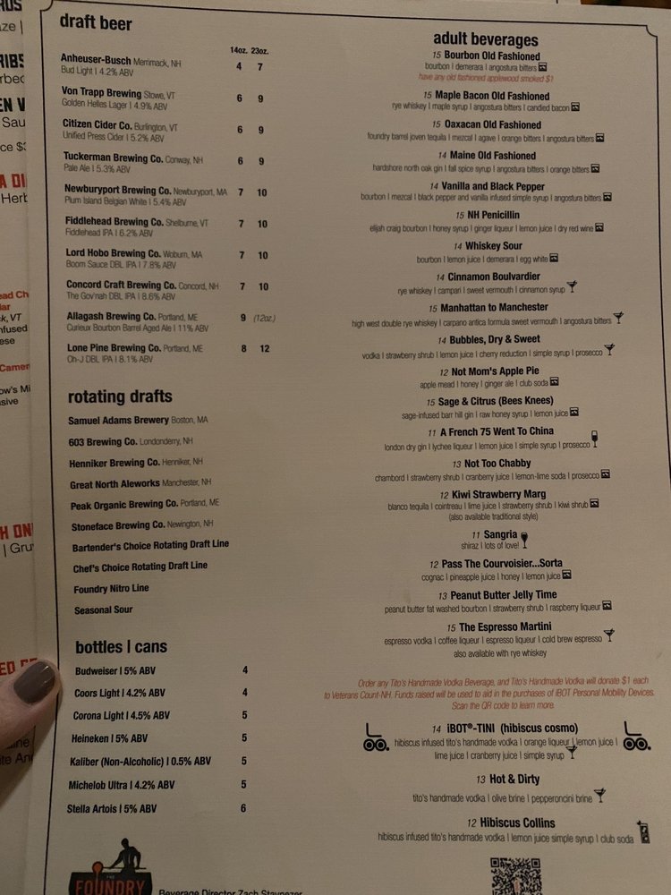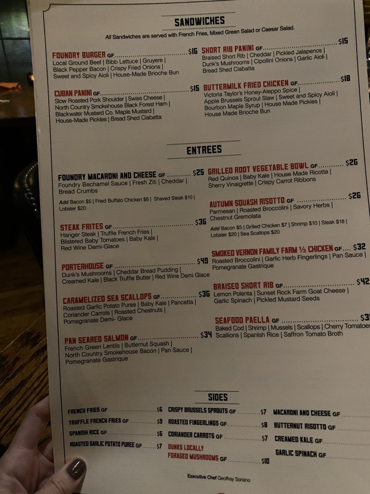 Introducing The Foundry Restaurant, a cocktail bar offering a variety of American dishes and signature chicken wings. Located at 50 Commercial St in Manchester, NH, this upscale establishment is known for its warm and inviting atmosphere, a mix of log cabin, brick house, and industrial vibes. With a capacity to seat up to 400 guests, The Foundry prides itself on being the largest certified farm-to-table restaurant in New Hampshire. Customer reviews rave about the exceptional service provided by knowledgeable and friendly staff. The menu features creative dishes like Fig & Apple Panini with bacon jam, Braised Short Ribs with sweet potato gnocchi, and Grilled Peach Salad. The restaurant also offers an impressive selection of cocktails and desserts. For a memorable dining experience with locally sourced ingredients and top-notch service, The Foundry is a must-visit spot in Manchester.