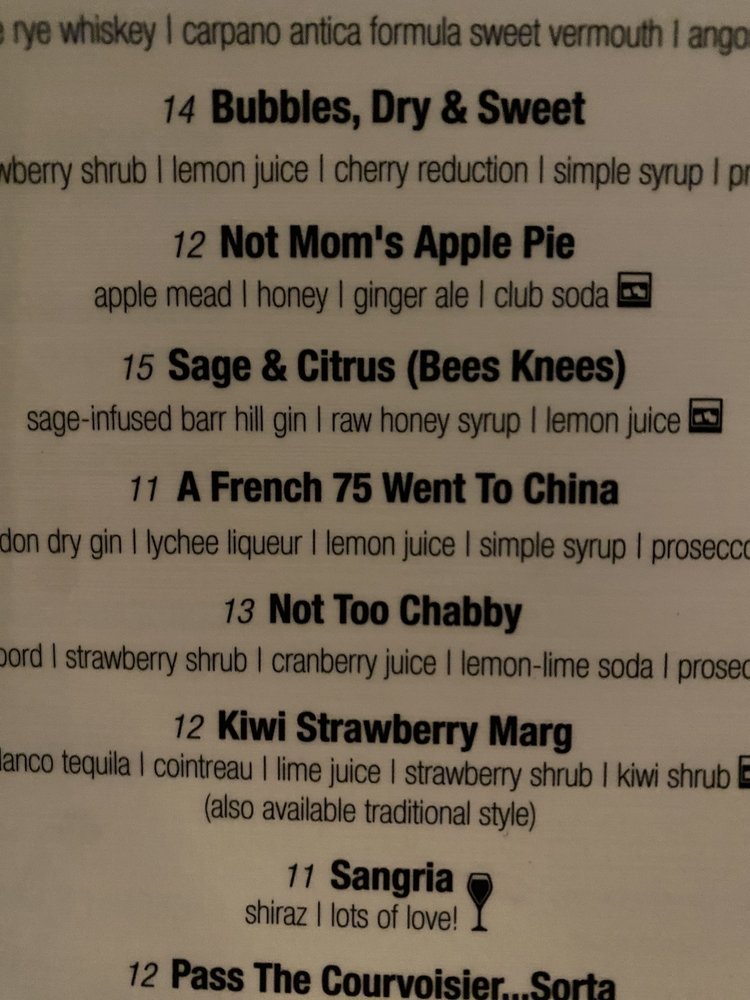 Fabrizia limoncello, raspberry puree, muddled mint, simple syrup & fresh lemon juice topped with prosecco